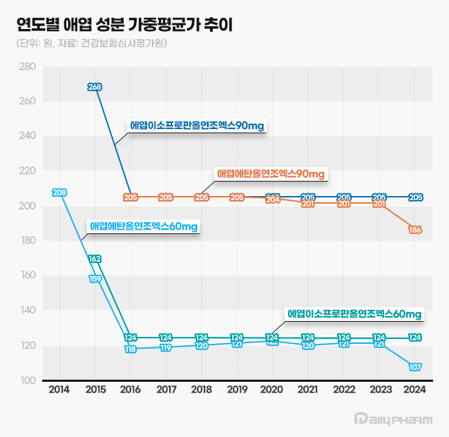 천연물의약품 애엽 추출물 위염치료제가 우여곡절 끝에 시장 퇴출을 모면했다. 하지만 반복적인 약가인하로 100원 미만 제품이 속출했다. 2년 전 생물학적동등성시험을 수행하지 않았다는 이유로 무더기로 약가가 인하된 데 이어 급여 생존의 대가로 또 다시 약가가 큰 폭으로 떨어졌다. 10년 전과 비교하면 애엽 추출물 의약품의 약가는 60% 가량 감소하면서 제약사들은 원가 부담을 걱정해야 하는 처지다. 보건복지부는 지난 29일 건강보험정책심의위원회를 열어 내달부터 애엽 추출물 성분 의약품 74종의 보험상한가를 평균 14.3% 인하하는 내용의 안건을 의결했다. 애엽 성분 의약품은 쑥을 기반으로 만드는 천연물의약품으로 동아에스티의 ‘스티렌’이 오리지널 제품으로 급성위염과 만성위염의 위점막 병변, 출혈, 발적, 부종 등의 개선에 사용된다. ‘비스테로이드소염진통제(NSAID) 투여로 인한 위염 예방’ 적응증도 보유 중이다. 스티렌투엑스는 주 성분의 용량을 60mg에서 90mg으로 늘려 1일 2회 복용하는 고용량 제품이다.