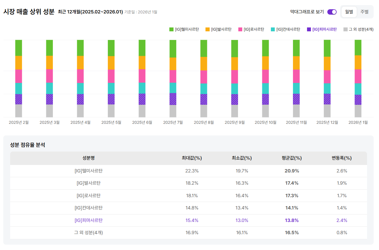 | 텔미사르탄 (C09CA07) | 가장 긴 반감기로 24시간 안정적인 혈압 조절이 가능하여 시장 점유율 1위 (21.22%) 차지 |