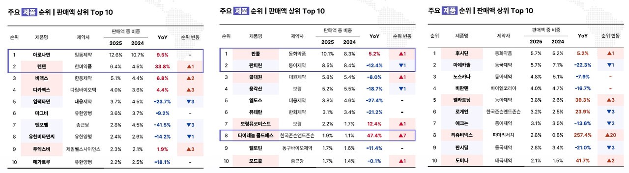 2025년 국내 일반의약품 시장은 비타민, 기침·감기 매출 상위 카테고리 순위는 유지됐지만, 판매액과 판매건수 모두 감소하며 성장 동력이 둔화된 것으로 나타났다. 제약 산업을 읽는 데이터 플랫폼 BRP인사이트에 따르면 2025년 판매액 기준 상위 10개 시장 중 9개 시장 규모가 2024년에 비해 줄었다. 상위 10개 시장 판매액의 합은 전체 시장의 70% 수준으로 올해도 상위 영역 내에서 방어 또는 회복 여부가 결정될 것으로 보인다. 보다 자세히 살펴보면 상위 3개 시장은 비타민·미네랄·강장(16%), 피부(12%), 기침·감기(11%)로 집계됐다. 이들 3개사의 합산 비중은 39%로 상위 집중도가 유지됐다. 다만 이들 상위 시장의 전년 대비 성장률은 각각 –7%, –3%, –14%로 모두 역성장 했다. 상위 시장이 유지되는 가운데 실제 매출 규모는 줄어드는 정체형 구조가 나타난 셈이다. 유일하게 성장한 시장은 항염·진통 계열로 이마저도 1%에 불과했다. 판매건수 기준으로는 감소 폭이 더 컸다. 2025년 판매건수가 가장 많았던 상위 10개사 합계 판매건수는 전년 대비 약 10.2% 감소했다. [약사공론| 26.02.12]