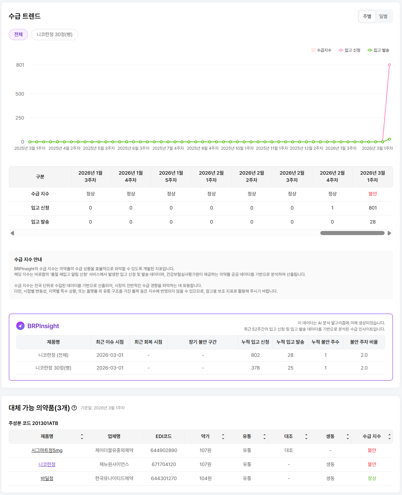 특히 1위를 기록한 '니코란정'은 전주 대비 입고 신청 지수가 급증한 반면,